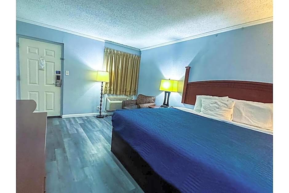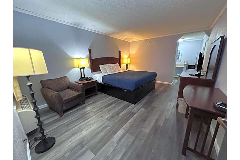 This room includes free Wi-Fi and cable TV. A fridge and a seating area are also provided.